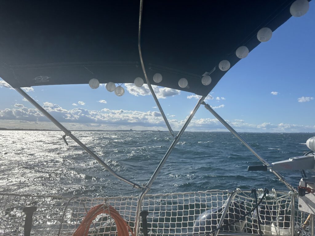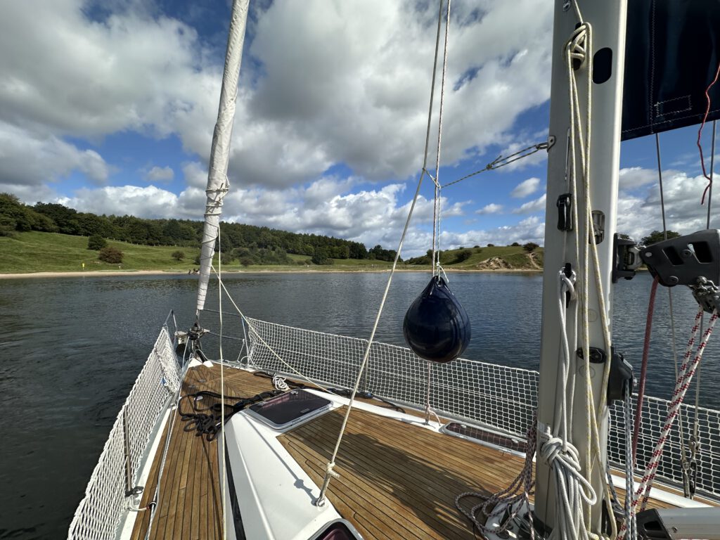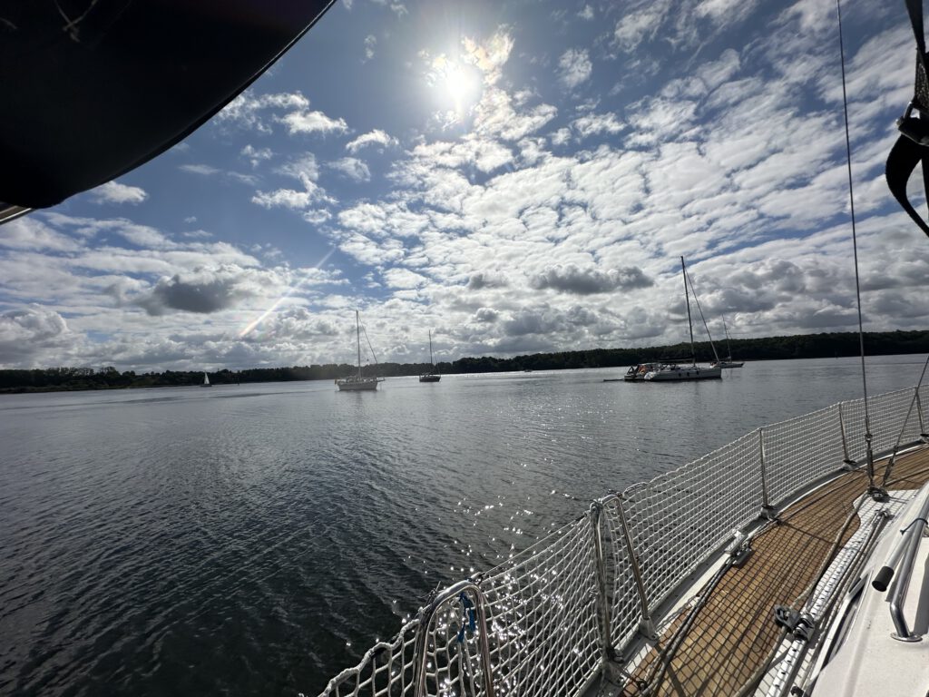 Bei ordentlicher Welle segeln wir über das Haff. Zunächst wollen wir in der Pötenitzer Wiek ankern, entscheiden uns dann aber spontan, noch ein Stück weiterzufahren. Schließlich fällt der Anker am Dummersdorfer Ufer – einem Naturschutzgebiet mit Strand, grünen Hängen und einer Wiese, die uns fast ein bisschen ans Auenland erinnert. Ein wunderschöner Platz für die Nacht – und vielleicht der richtige Ort, um diese Reise langsam ausklingen zu lassen.
