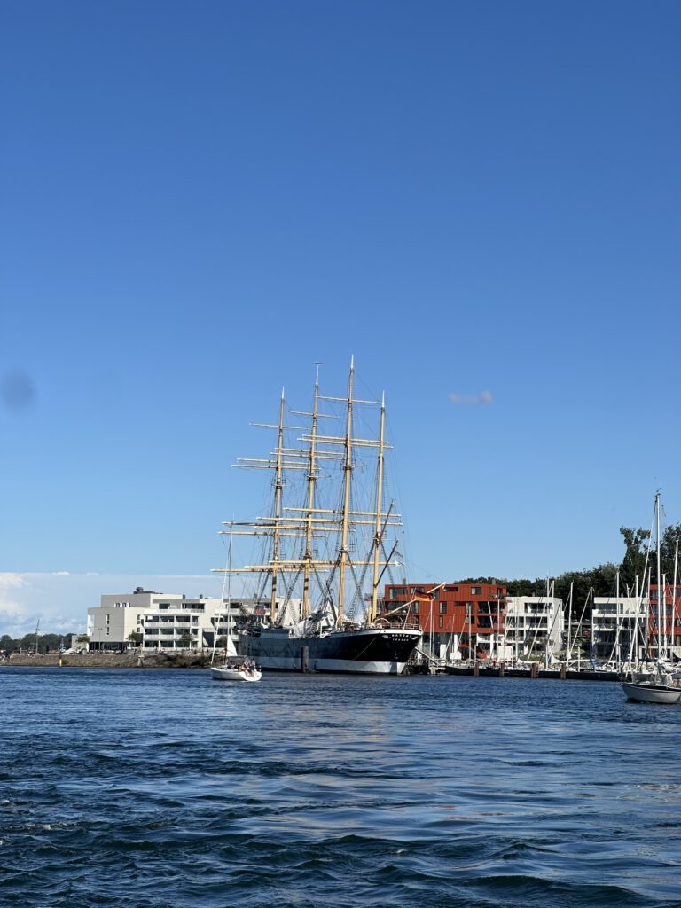 Auf der Zielgeraden kurz vor Travemünde Wir segeln an der „Passat“ vorbei – hier findet Ende kommender Woche die Hochzeit statt, wegen der wir überhaupt nach Travemünde kommenTraumhaftes Segelwetter