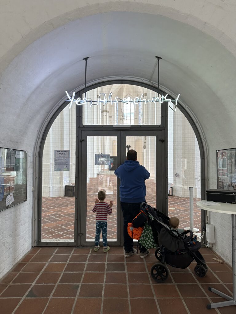 Auf dem Weg dorthin sehen wir eine Kirche – naja, nur von außen sieht sie so aus – beim Reingehen fällt uns auf, dass sie quasi „entkernt“ wurde bzw. alles, was eine Kirche typischerweise ausmacht, nicht mehr da ist, auch keine Sitzbänke mehr, es ist nun ein großer leerer Raum für Ausstellungen.