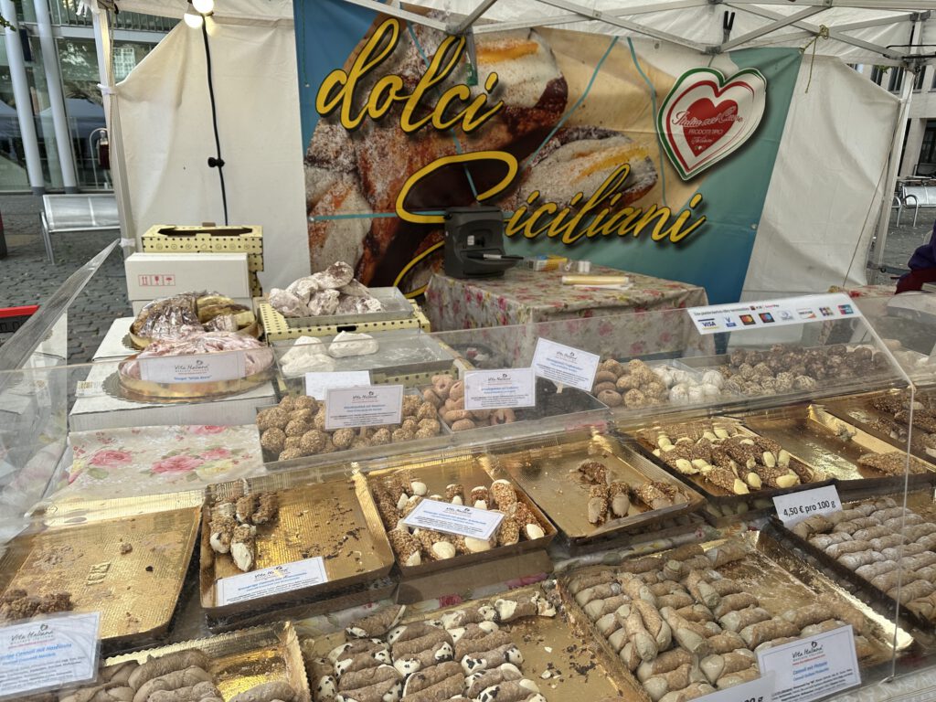 Auf dem Rückweg zum Boot kommen wir auf dem Marktplatz an einem italienischen Markt vorbei, hier gibt es italienischen Käse, Wurst, Süßspeisen (Canolli) – die Stände nach den verschiedenen italienischen Regionen aufgestrellt.
